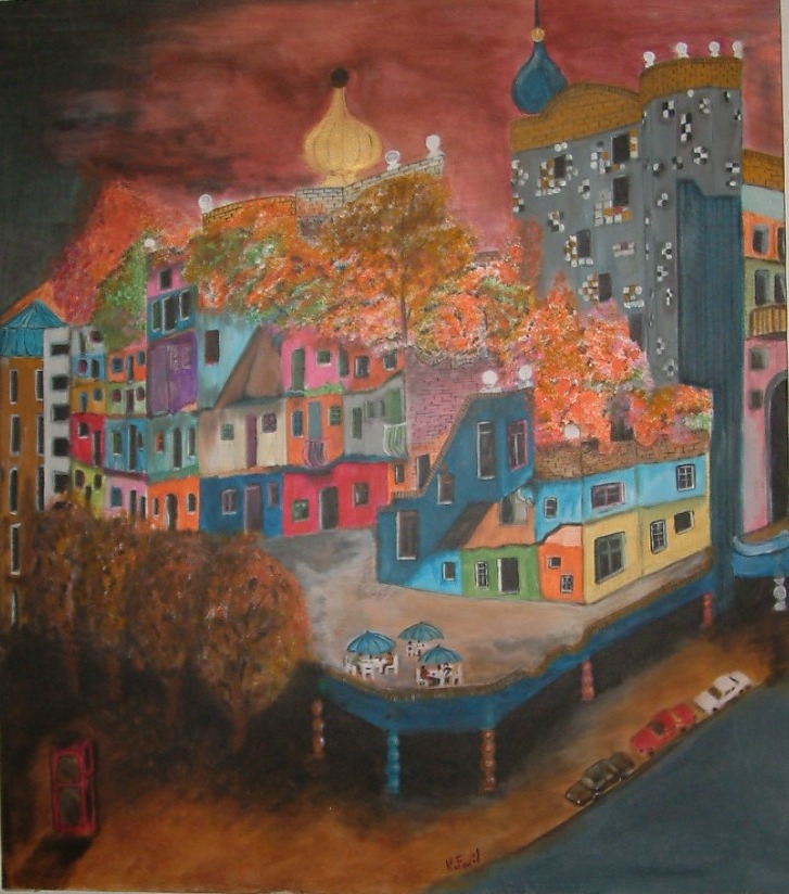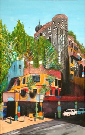 "Hundertwassergebäude Wien (Seitenansicht) " - 100% handgemalt (inkl. Signatur) auf hochwertiger Leinwand, gemalt 2008