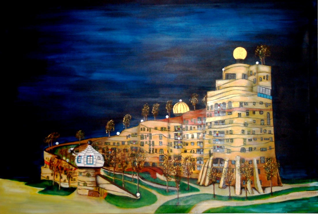 "Hundertwassergebäude Darmstadt (Rückseite)" - 100% handgemalt (inkl. Signatur) auf hochwertiger Leinwand, gemalt 2007
